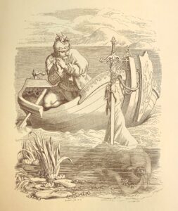 Tennyson’s poem, ‘Morte d’Arthur’, was published in 1842 and was the first of Tennyson’s poems to reimagine Sir Thomas Malory’s Le Morte d’Arthur, printed by William Caxton in 1485. Tennyson went on to publish Idylls of the King, a cycle of twelve poems that tell the story of King Arthur and his Knights of the Round Table. Evidently, Arthurian legends were popular in the 19th century with King Arthur embodying Victorian ideals of manhood and courtly love. However, Tennyson ultimately shows the fragility and futility of these ideals – following the death of Arthur, Camelot falls into ruin, a reminder of the transience of earthly power.